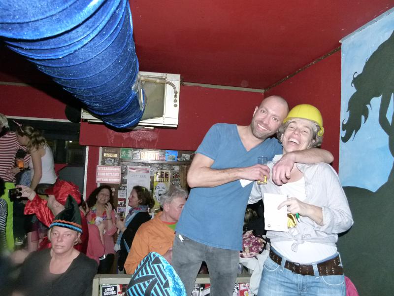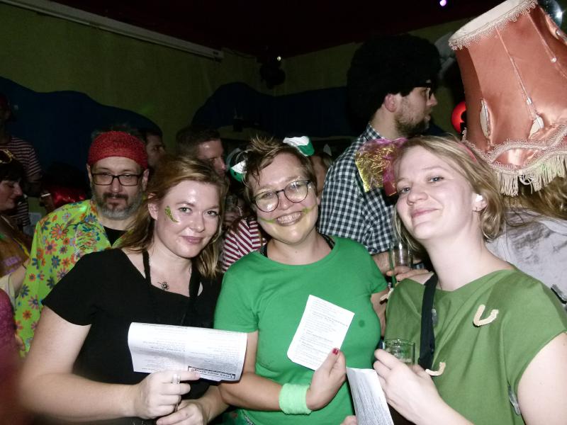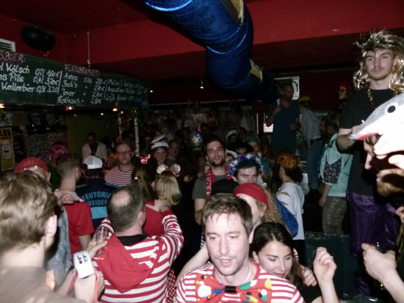 Für einen FC Fan war Sturm Sabine auf jeden Fall ausschlaggebend für seine Anwesenheit beim Einsingen in der herrlichen Südstadt-Kollektiv-Kaschämme: Er wollte eigentlich in Gladbach beim Fußball Derby sein, das wegen des drohenden Orkans abgesagt worden war. Auch das Blaulicht auf dem Karthäuserwall hing mit „Sabine“ zusammen: Dachziegelsicherung – nicht Ruhestörung war der Grund für den Polizeieinsatz vor der Kneipe. Besser – denn so konnten die kostümierten Gäste in bester Schunkelstimmung bis in den Sonntagabend hinein laut und kräftig singen. Unter anderem ein sehr lautes Votum gegen rechts: Die AG Arsch huh belegte den ersten Platz – zur besonderen Freude des Lotta-Kollektivs, das sich ein bisschen als Geburtshelfer von „Su läuf dat he“ sieht. Sie waren bei diversen Anti-Nazi-Demos Zeuge, wie die Rechten kölsches Liedgut für Ihre Zwecke einspannen wollten. Und machten darauf ein paar Musiker aufmerksam.