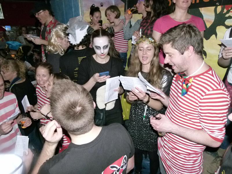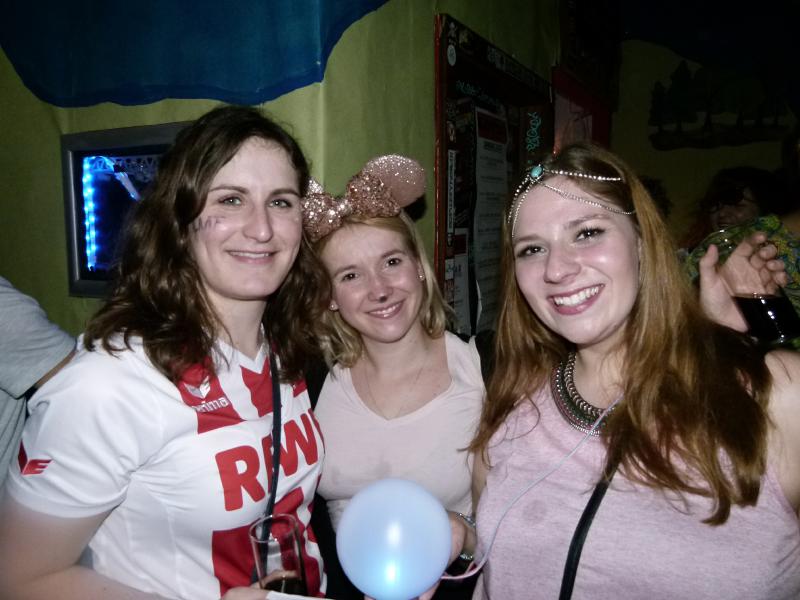 Drei schöne und clevere Thekenmädchen, die wegen der Getränkeversorgung keine Hand frei hatten, klebten die Refrainzettel kurzerhand an die Thekendecke, und konnten auf diese Weise genauso mitsingen wie der Rest des Ladens. BEsungen wurden die Mädels natürlich auch – und der neidisch gewordenen Köbes Marco bekam kurzerhand eine Perücke geliehen – und eine Extra-Strophe gesungen. Eldorado auf Platz 4